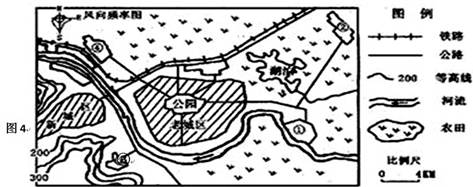 1.从风向频率图可以看出,该城市南风和东风频率大,从大气污染角度,化工区应布局在城市北部和西部地区,化工需要大量水,从河流流向看,④位于河流下游。