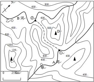 【小题1】图中的等高距为200米,最高处山顶海拔是1860米,Q点与P点间隔四条等高线,说明相差800米,那么1860-800=1060米,在选择中D最接近该海拔高度,所以D正确。