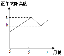 3、单选题 右图为某地5~7月份正午太阳高度角的变化示意图。读图回答下列小题。