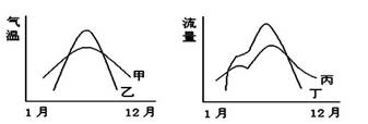 小题3:围湖造田使湿地面积缩小,则湿地调蓄河流径流量的能力下降,河流流量的季节变化较大,且湿地调节气候的能力下降,则年温差变大,故乙、丁曲线符合。