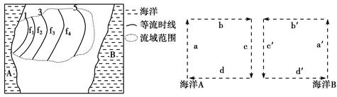 5、单选题 下图是某流域等流时线图(等流时线是流域内的降雨汇流到河口所用时间相等的点的连线。此图以小时为单位)及两组水循环示意图。读图回答下列各题。