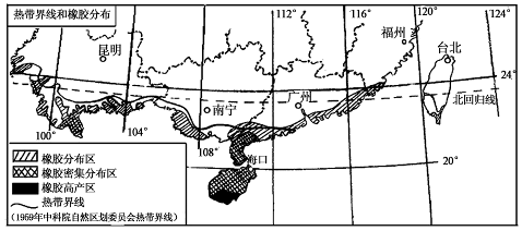 1、综合题 天然橡胶喜高温、高湿,年均温在19℃以上,以21~27℃为宜,年降水量1000~1500mm,相对湿度70~80%;静风向阳,风速小于3米/秒。天然橡胶喜肥沃深厚的土壤,土层厚度大于60cm,越冬低温天气是橡胶生长的限制因素,当温度小于5℃就会引起冻害,温度小于0℃会引起严重冻害,时间较长则引起死亡。读我国天然橡胶优势产区分布图,回答问题。(24分)