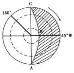 (2)在图上相应位置用斜线画出夜半球。(2分)