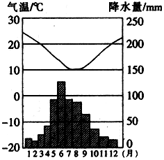 (4)下图为非洲某地区气温和降水量统计图,该地区最可能位于图中的_________(填数字)地。该地区的气候类型是_____________。(4分)