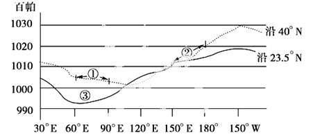 3、单选题 下图是某月份海平面平均气压沿两条纬线的变化图,分析回答下列问题。