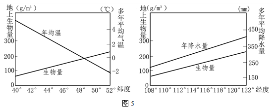 5、单选题 生物量一般是指生物在某一特定时刻单位空间的个体数、重量或其含能量。图5示意我国某区域地上生物量、年均温和年降水量随经纬度的线性变化。读图回答3题。