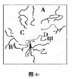 1、单选题 图4是“某大洲水系示意图”, 图中平均地势最高的点是(? )