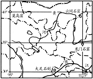 2、综合题 石窟艺术在我国已有数千年的历史。人们在山崖上开凿洞穴,并进行绘画和雕塑,以表达对宗教的虔诚。下图为"我国著名石窟分布图",读图完成下列问题。