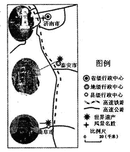 1、综合题 (10分)【旅游地理】济南、泰安、曲阜是“山水圣人”旅游联合体的合作城市,也是山东最负盛名的旅游线路。下图为“山水圣人”旅游线路示意图,读图完成下列问题。