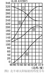 4、单选题 读图2“北半球太阳辐射的纬度分布图”,分析回答问题。