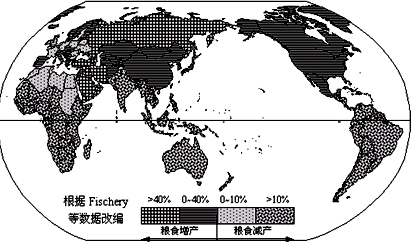 2、单选题 全球变暖是当今世界面临的重大环境问题之一。图是“全球温度上升3℃后,世界不同区域靠雨水耕作的粮食产量增减状况”示意图,完成下列各题。