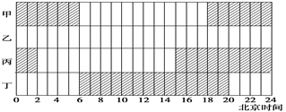 小题2:根据图示丙地的昼夜分布判断,其日出时间为北京时间的2点,世界标准时为0时区区时,较北京时间晚8个小时,故计算得前一天的18时。