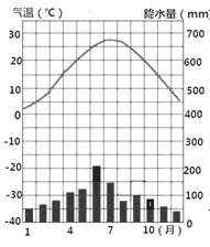 材料三:图为该山山麓地区气候资料图 (曲线表示气温,柱状图表示降水)