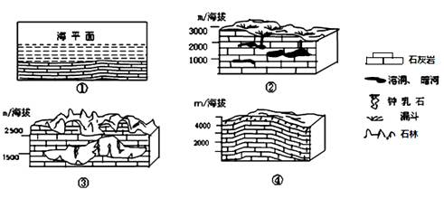 (1)根据材料二判断,该山喀斯特地貌发育过程的先后排序是______________。(2分)并结合材料二和三,从地质作用角度说明该山喀斯特地貌形成的主要过程?(4分)