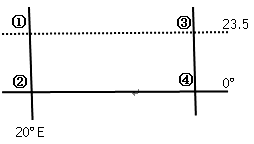 3、单选题 图中,②点为12:00,太阳高度为90°;④点为昏线与赤道的交点。读图回答问题。 |