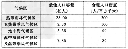 (2)按表格推算下列气候类型所在地区,远没有达到最佳人口容量和合理人口密度的是