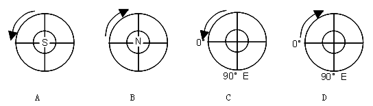 5、单选题  下面四幅极地俯视图中,能正确表示地球自转方向的是: ?(?)