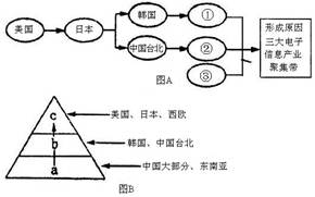 本题解析:1.图A中①、②、③分别是我国三大电子信息产业聚集带,即环渤海地区、珠江三角洲和长江三角洲,韩国IT产业就近转移到环渤海地区。第1题选C。