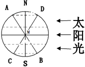 小题2:结合上题分析,当晨昏线处于CD处时,为北半球冬至日,当晨昏线处于AB处时,为北半球夏至日,故晨昏线从CD变化到AB的位置时,太阳直射点始终向北移,北半球各地昼长逐渐变长,夜长逐渐变短,B项正确。