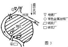 1、单选题 读图3,从环境保护的角度考虑,图中四个工厂区位选择比较合理的是(?)