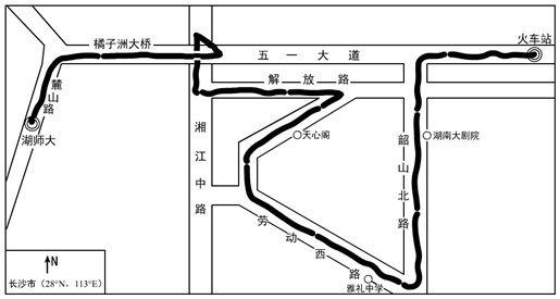 5、单选题 家住湖北的小周在2011年的高考中考取了湖南师范大学。下面是他在9月1日前往湖师大报到的部分行程记录:“今天的心情,和这里的天气一样晴空万里,充满欢喜……火车终于驶入长沙……出了火车站,我上了202路公交车,找了靠近车门一侧的窗户边的一个座位坐下。此时我看了一下手表,时间是11:08,呵呵,时间不早了……202路公交车里面干净宽敞,空调效果很好,车辆运行时几乎没有什么声音。再仔细一瞧,原来,它是一辆纯电动车!……车辆经过湖南大剧院、雅礼中学、天心阁、橘子洲大桥,终于来到了我梦中的湖师大!走下202,抬起手腕,呵呵,真巧啊,通过手表上的指南针发现,我现在的影子正朝向正北!……”下图为长沙市202路公交车自火车站至湖师大路线示意图,请根据小周的描述,回答第1—3题。