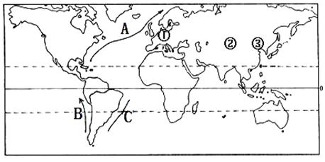 (3)在图中用箭头画出经过C处的洋流方向。C洋流为 ,从性质上看是 ,从成因上看它受 的影响。