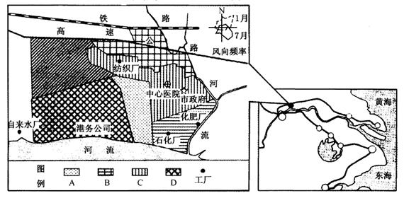(2)为了改善城市环境质量,应将石化、化肥等重污染工厂搬迁到 A 、B、C、D 区域中的?区。但由于资金等问题,目前搬迁难度大,现又准备对 C 区街道进行改造,则应重点拓宽走向的街道,原因是?