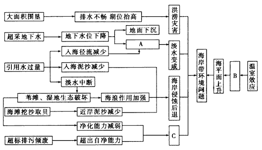 4、综合题  下图为“黄河三角洲某海岸带环境问题示意图”。读图回答下列问题。