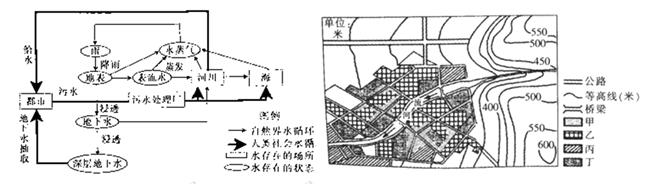 5、单选题 下左图为我国东部某城镇土地利用类型分布示意图,下右图为城市水循环系统模式图。读图,完成下列问题