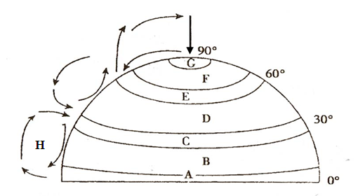 第(1)题,由C、E所在纬度可知,气压带C、E分别是副热带高气压带和副极地低气压带。