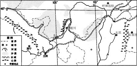 小题1:某长城驴友游览长城时,看到长城以北,沙海茫茫;长城以南,沙海中一条绿色生态长廊沿铁路延伸,该驴友看到的景观地点最有可能位于图中的