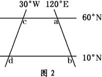 小题2:可以画出另外一幅实际的经纬网图(图2),ab和cd线对调位置,从图2上可知a在d的东北方向,cd线经度为30°W。