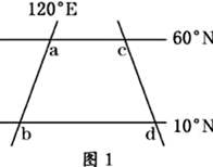 本题解析: 小题1:可以画出实际的经纬网图(图1),从图1上能读出四条线间的长度关系是:ab=cd,bd>ac,ac≈(1/2)×cd(60°纬线周长约是赤道的一半,赤道上50个经度的距离和50个纬度的距离相等)。