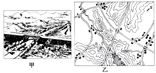 5、单选题 下面二幅图中,甲图为一兴趣小组在郊外考察时绘制的一幅景观图,乙图为该地等高线图,当时小组同学在图乙中的地点及其观察方向是( )