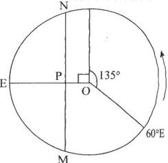 小题1:由地球自转方向知图为北半球,M、N两点是晨昏线与某若纬线圈的交点可知,若MEN弧为白天,又知MN垂直于OE,P为MN的中点,则OE经线上为12点,计算得世界时为17点。若MEN弧为黑夜,计算得世界时为5点。根据选项知A正确。