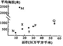 3、单选题 右下图是各大陆的面积和大陆平均海拔高度关系示意图(图中字母为各大陆的代号),M大陆是