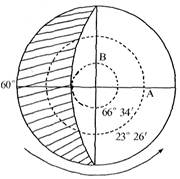 4、单选题  读下图(阴影部分表示黑夜),回答三题。