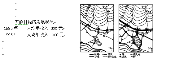1、综合题 五岭县地处我国西南地区。图A和图B分别概略地反映了该县20世纪80年代和90年代的面貌。阅读图和相关资料,分析以下问题。(20分)