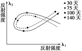 4、单选题  判读卫星遥感图像时常使用对比分析法,具体说就是对不同时间、不同地面物体的卫星图像进行对比和分析。如下图,虚实两线分别代表玉米和大豆两种农作物对两种不同电磁波的反射强度(图中符号分别代表播种30、75、100、140天后的农作物反射的电磁波的强度)。读图,回答问题。