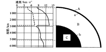 (3)无论纵波还是横波在经过a界面时,速度都明显加快,a为__________界面,其以上部分A为__________圈层;横波经过 b界面时消失,纵波速度突然减缓,b为________界面,其以下部分C为________圈层,其以上部分B为_______圈层。