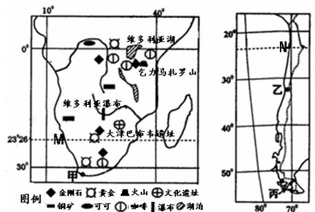 参考答案:(1)8400—8700km(2分),甲地是海陆分布(2分),乙地是地形起伏(安第斯山的阻挡)(2分) (2)都有寒流(上升流或补偿流)经过(2分)渔业资源丰富(2分)多海雾(2分)。 (3)气候资源:以热带气候为主,光热资源丰富;(2分) 矿产资源:金刚石、铜矿、金矿等矿产丰富;(2分) 旅游资源:乞力马扎罗山、维多利亚瀑布、大津巴布韦遗址等独特的 自然景观和人文景观;(2分) 生物资源:有世界上最广的热带草原分布, 盛产热带经济作物咖啡、可可等。(两点任答一点给2分) (4)安第斯山(2分);该山脉西坡雪线高度由北向南逐渐降低(2分)。 由北向南纬度升高,气温降低(2分),由北向南降水增多。(2分) (5)自西南向东北(或自西向东)(2分);夏季(1月)南北温差小,气压梯度力小(2分), 西风强度弱,流速减慢(2分);冬季(7月)情况相反,流速快。(2分)