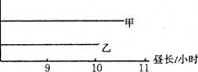 小题1:根据甲地昼长较乙地长,判断甲地位于乙地的南方(可画出东半年的晨线分布)。又由于越往北昼越短,即日出越晚。而此时甲乙两地同时日出,说明偏北地乙地位于东侧。则甲地位于乙地的西侧。