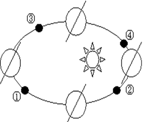 1.根据地轴倾斜方向判断,图中地球所在位置对应节气如下图所示,根据地球自转方向的判断,2012年元旦地球在公转轨道位置应在冬至日之后的④处。