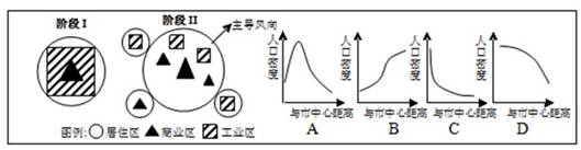 1.图中能正确反映Ⅱ阶段都市人口密度与距离市中心的远近两者之间关系是2.Ⅱ阶段城市不会发生的现象有