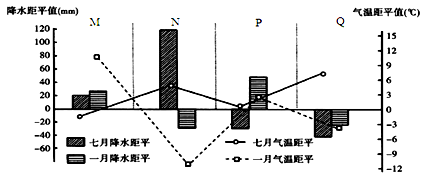 (2)甲、乙、丙、丁四地分别为温带海洋气候、地中海气候、温带大陆气候、温带季风气候。M七月和一月降水距平均为正值,且差别不大,说明该地降水丰富且季节变化小,为温带海洋气候,对应甲地;N七月降水距平很大,说明降水总量大且集中在夏季,问温带季风气候,对应丁地;P一月降水距平为正,七月为负,说明降水主要在冬季,为地中海气候,对应乙地;Q一月和七月降水距平均为负值,说明该地降水稀少,为温带大陆气候,对应丙地。