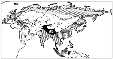 (1)④地位于阿拉伯半岛,北回归线从此处穿过,使得该地常年受到副热带高压控制,炎热干燥,形成热带沙漠气候;⑥地位于大巽他群岛,赤道从此处穿过,使得该地常年受到赤道低压带控制,高温多雨,形成热带雨林气候。
