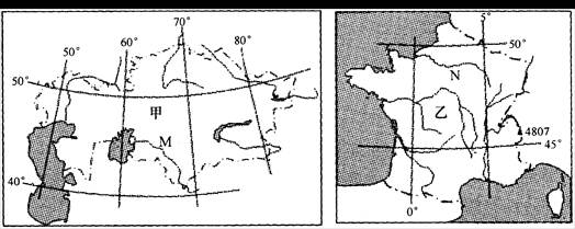 (2)甲国是哈萨克斯坦,与法国相比。哈萨克斯坦深居亚欧大陆内部,远离海洋,受海洋影响小,气候大陆性强;是典型的温带大陆性气候。夏季气温高于乙国,冬季气温低于乙国 ,所以气温年较差大于乙国。降水量少,多晴天 ;白天,大气对太阳辐射削弱作用小,气温高;夜晚,大气对地面保温作用小,气温低。乙国则受大西洋的影响大。所以,甲国气温年较差和日较差都大于乙国。