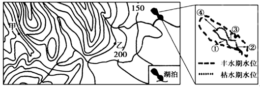 【小题1】根据图中丰水期和枯水期水位的变化,④处丰水期与枯水期水位线水平距离最大,说明该处地势最为平坦,D对。水位线水平距离小的地方,说明地势较陡,A、B、C错。