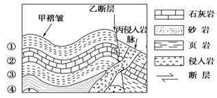 【小题1】沉积岩层的沉积顺序是下面的先沉积,上面的后沉积,把其它岩层切断的岩层形成的晚,所以图中①沉积层形成最早,然后是③,之后因岩浆侵入,形成了岩层②,④是上覆沉积层,形成最晚,故B正确,A、C、D错误。