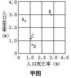 3、综合题 (12分)甲图表示四个不同国家的“人口死亡率”和“人口出生率”的关系,乙图人表示人口再生产类型的转变过程,读甲乙两图回答问题。